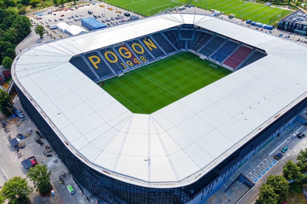 Nouveau stade inauguré le 1er octobre 2022 pour le stade du Pogoń Szczecin, qui peut accueillir 21 163 spectateurs (source : https://pogonszczecin.pl/klub/stadion).
